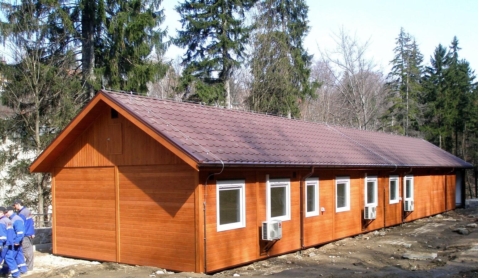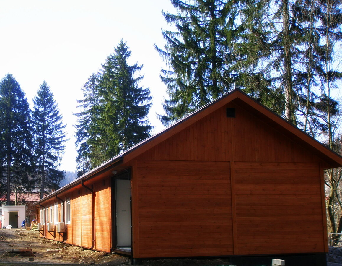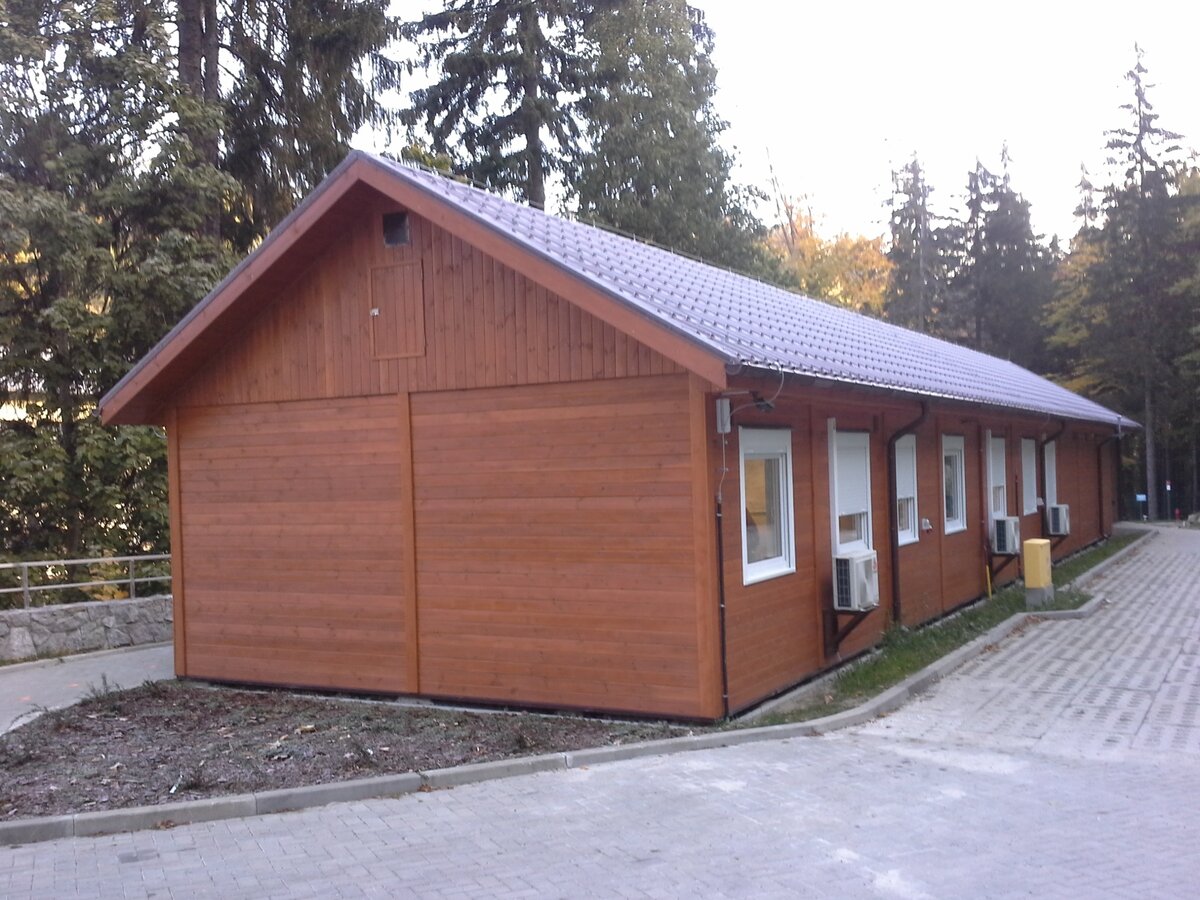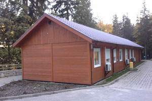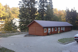 Konstrukcja postawiona na fundamentach stałych posiada dwuspadowy dach.