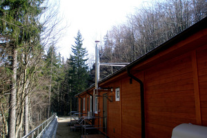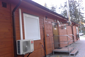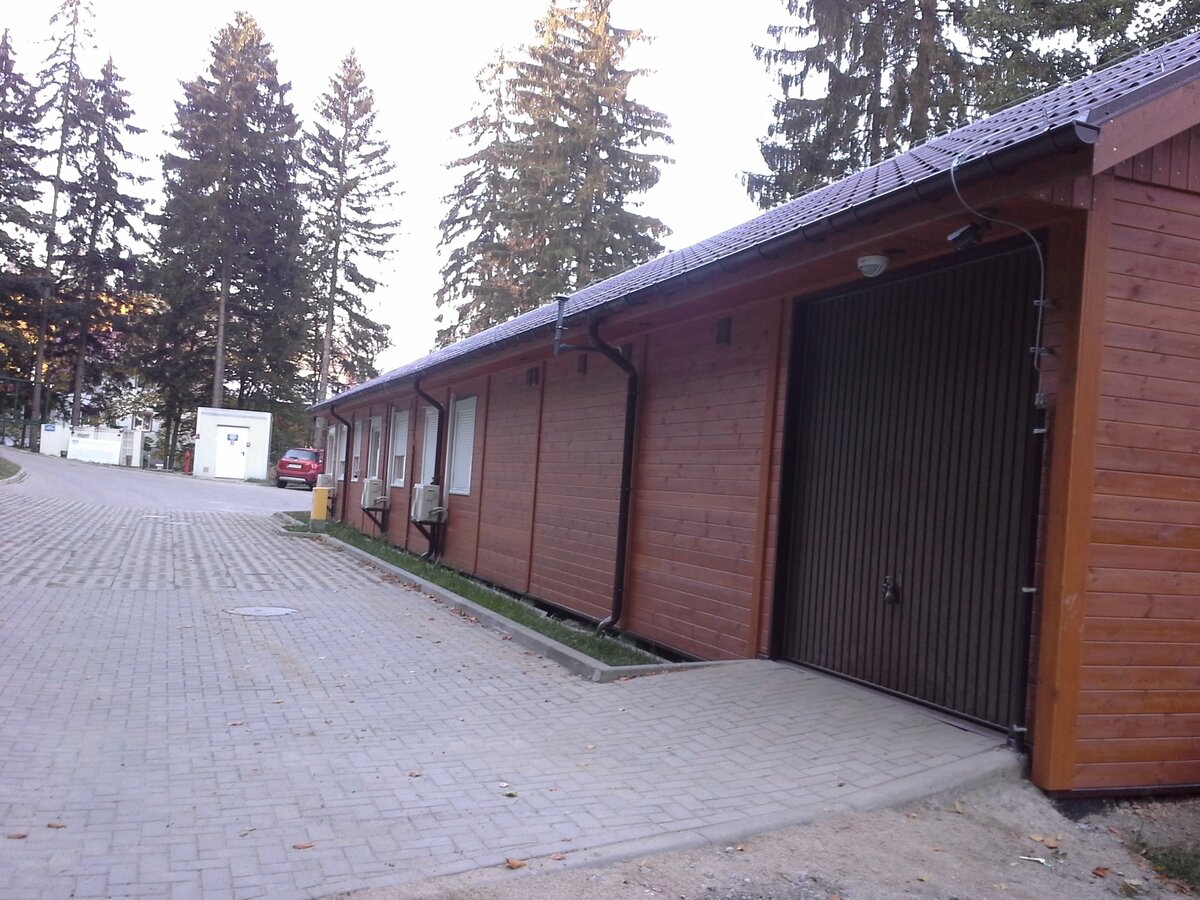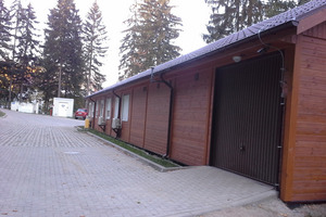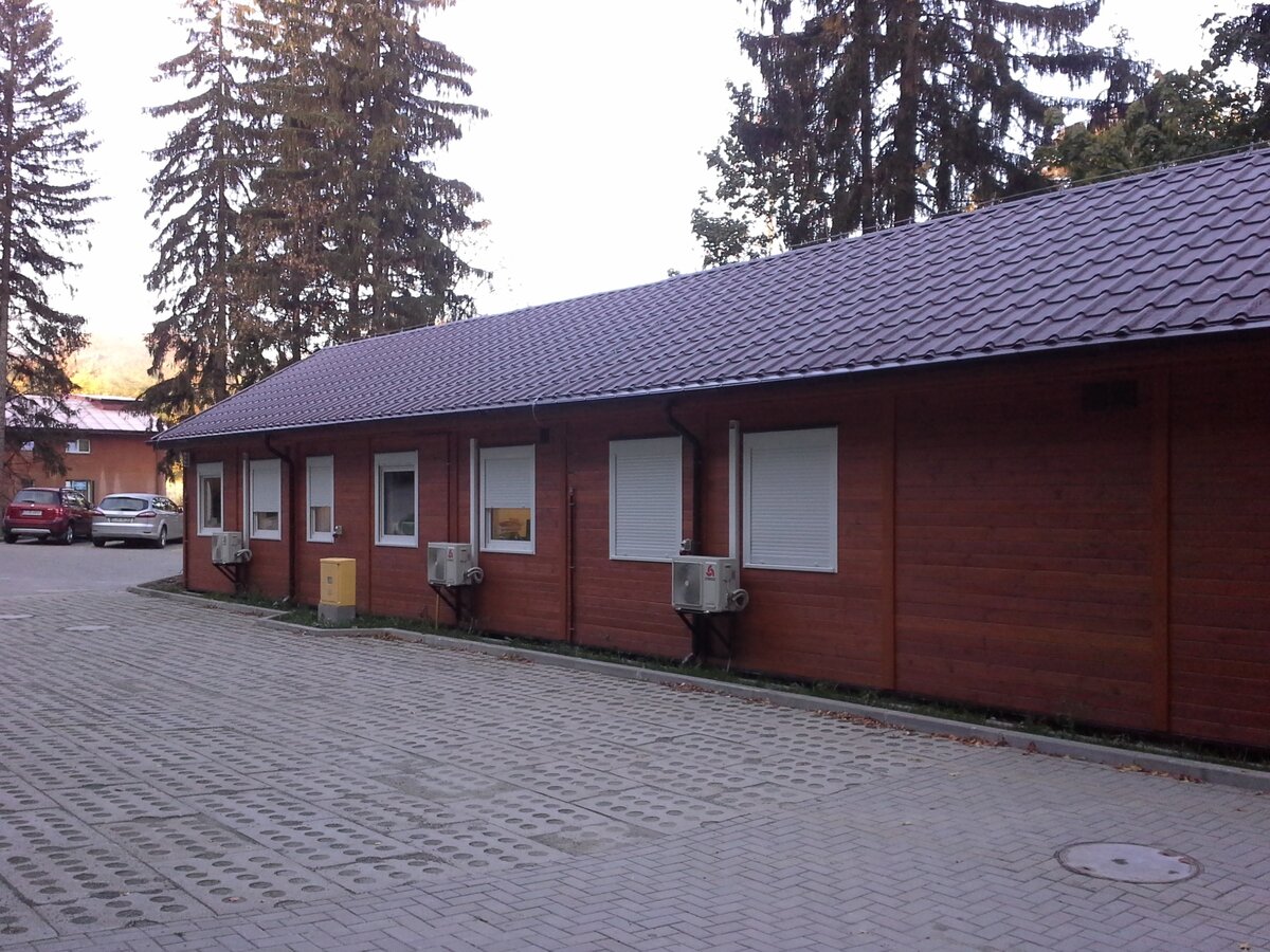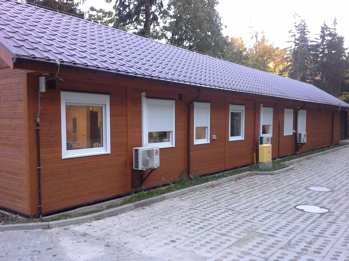 Konstrukcja postawiona na fundamentach stałych posiada dwuspadowy dach.